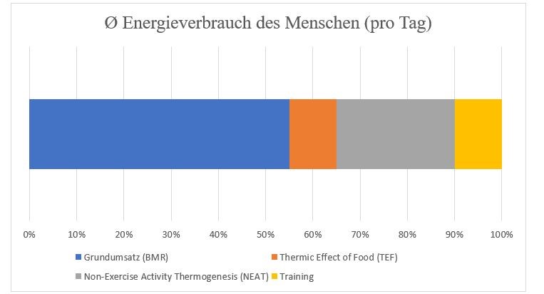Die genannten Zahlen sind konsequenterweise nur als Durchschnittwerte zu interpretieren, welche sich meist auf sesshafte Populationen beziehen. Steigt das Trainingspensum stark an, wie es bei Sportlern der Fall ist, so sinken zwangsläufig die Kontributionen von Grundumsatz, TEF und NEAT anteilsmäßig.