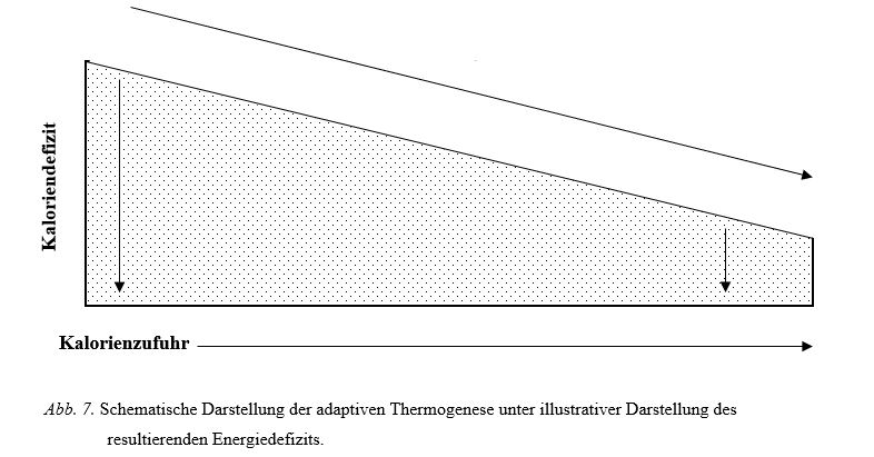Oftmals fällt der Energieverbrauch des Körpers im Laufe hypokalorischer Bedingung jedoch weiter ab als durch eine Veränderung der Körperkomposition erklärt werden kann. Dieser Prozess wird adaptive Thermogenese genannt (Camps, Verhoef, & Westerterp, 2013) und ist, im Kontext eines Energiemangels, leicht zu erklären (Trexler, Smith-Ryan, & Norton, 2014). Der Körper spart sich die Energie für wichtige physiologische Überlebensprozesse und reduziert gleichermaßen „unwichtige“ und energieaufwändige Prozesse, wie bspw. die Neubildung von (Muskel-)Proteinen (Browne & Proud, 2002; Witard, Garthe, & Phillips, 2019). Ein solcher Abfall der Proteinsynthese ist somit auch als primärer Grund zu nennen, warum muskuläre Atrophie in Zeiten von Energierestriktion auftritt. Auch wenn der Anpassungseffekt der adaptiven Thermogenese bisher gleichermaßen kritisch in Frage gestellt wird (Flatt, 2007), scheinen ein Verlust von Organzellmasse (Gallagher et al., 2017), reduzierte Schilddrüsenaktivität (Tremblay, Royer, Chaput, & Doucet, 2013) sowie gesteigerte muskuläre Effizienz (Rosenbaum et al., 2003) allesamt zu einem Abfall auf der „out” Seite beizutragen. Das bedeutet wiederum, der Körper wird innerhalb einer Diät effizienter bei der Einteilung der eigenen Energieverfügbarkeit. Und auch wenn die einzelnen Teilsysteme des TEE nicht oder nur leicht auf die Energierestriktion reagieren, so kann die Summe aller Teilsysteme doch erheblichen Einfluss auf den Diätfortschritt entfalten.